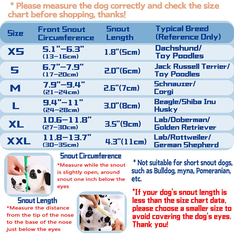 【Satisfying Service】---Please read our size chart carefully before purchasing. Tips: A few dogs will feel uncomfortable using our cloth muzzle for the first time. In order to achieve the best effect, please read our instructions carefully after purchase. If you have any questions, please contact us by email, we are very willing to do our best to give you the most satisfactory answer!